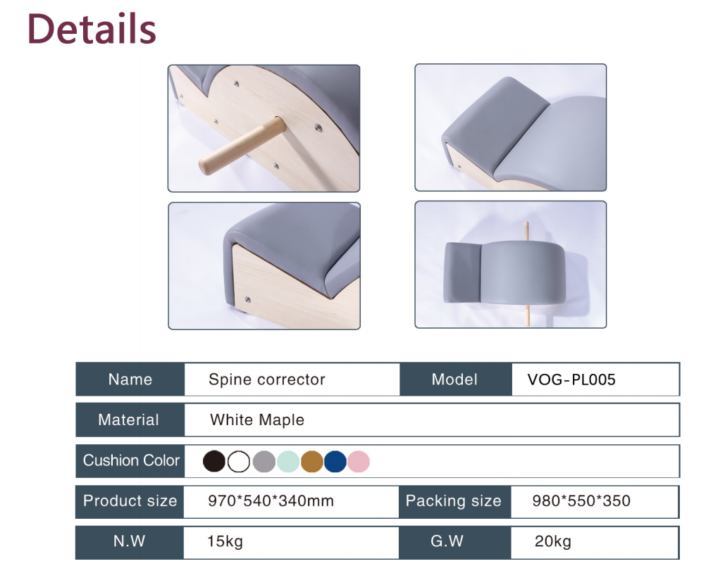The Spine Corrector offers various workout possibilities to help improve posture by lengthening and strengthening the torso, shoulders muscles, back, feet and legs restoring the spine’s natural curvature. Great for adding an extra dimension to mat work classes, ideal piece of equipment for aligning and mobilizing the spine and to assist with improving posture. Includes removable solid maple pole and cut out hand holes to commodate more exercise possibilities